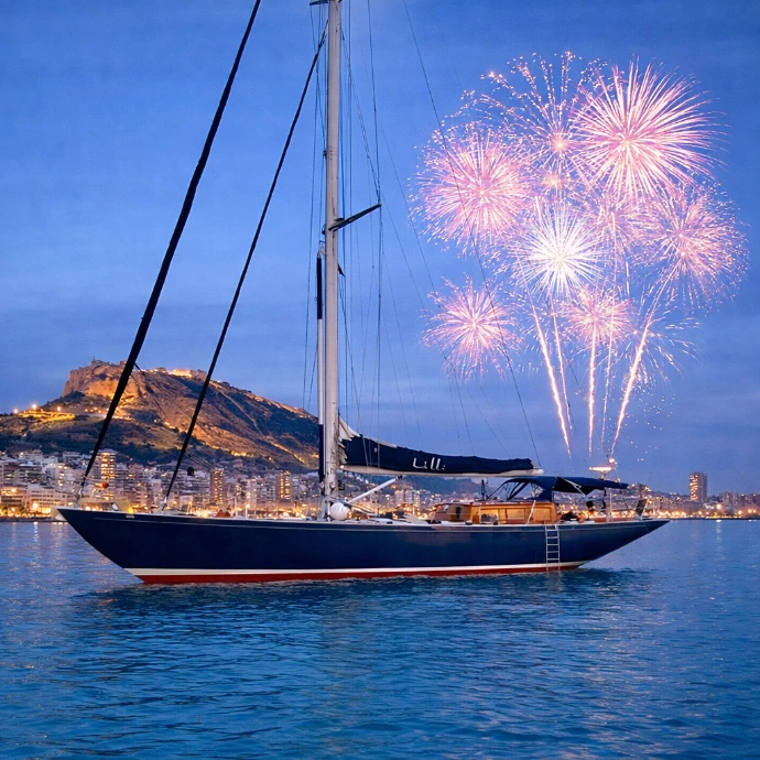 Wir ankern vor dem Stadtstrand von Alicante und genießen das farbenprächtige Feuerwerk über dem Meer. Anschließend bringen wir Sie sicher zurück in den Hafen.